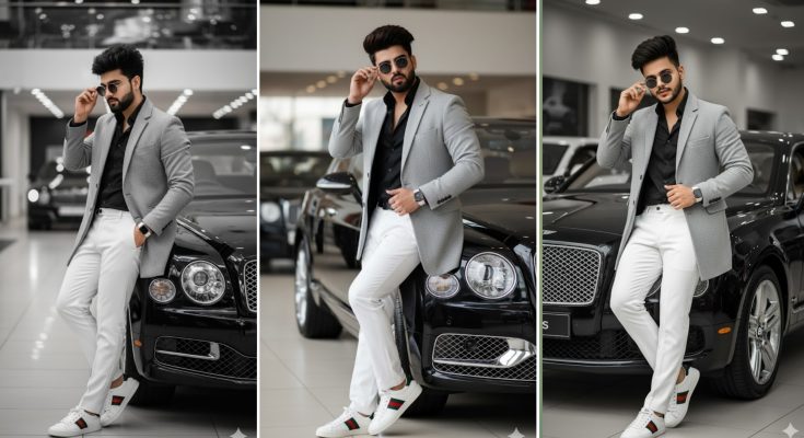 “A stylish young man in a sleek showroom leans confidently against on edge of luxury Black Bentley Mulsanne. Hand near his face,He wears a light gray overcoat,black shirt with White tailored trousers, a partially buttoned shirt, and white designer sneakers with red-green accents. Round sunglasses, white apple watch, and neatly styled hair emphasize his modern,affluent vibe. The scene should feel polished, high-contrast, and cinematic, with soft studio lighting.”Generate Image