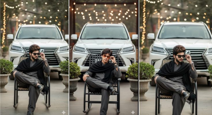 “A confident man slightly turned toward the right side while sitting on a black metal rocking chair with a lattice pattern on the seat and back, positioned in front of a powerful White Lexus LX, showing the full front of the Lexus clearly. He is wearing a dark gray shalwar kameez with a black shawl elegantly draped over one shoulder. He is also wearing black sunglasses, with one hand resting on the sunglasses as if adjusting them. One leg is crossed over the other in a relaxed yet dominant posture. The background features blurred warm string lights and potted plants, creating a cinematic and classy atmosphere. Soft natural daylight, muted colors, luxury aesthetic. Don’t change the face 100 percent reserved.”