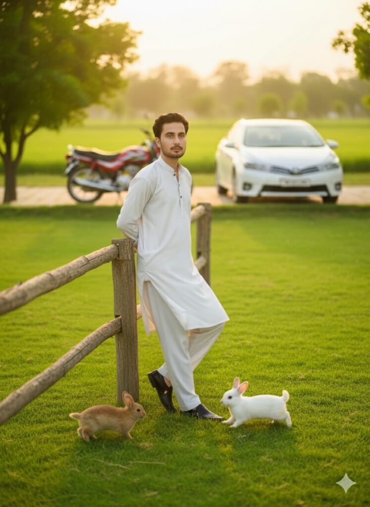 A ultra-realistic man leaning casually on a wooden fence in a Punjabi village farm filled with green grass, trees, and an orange sunset sky. He wears a white Punjabi outfit with a golden wristwatch and black branded shoes, and a light breeze gently moves his outfit. In the background, a red Honda 125 and a white Corolla Grande are parked neatly around 70 inches behind him. A few small rabbits jump around near his chair. The golden light reflects softly on his face and clothes. The man’s face stays exactly the same as in the given picture, and the overall photo looks ultra-original, cinematic, and realistic.