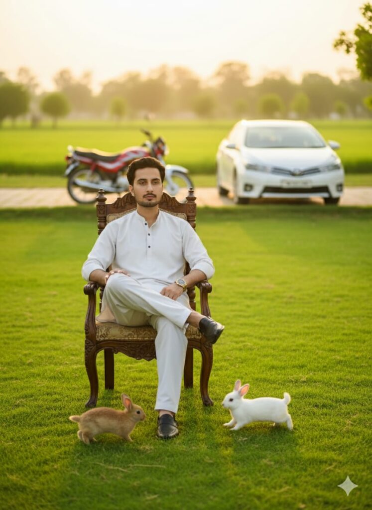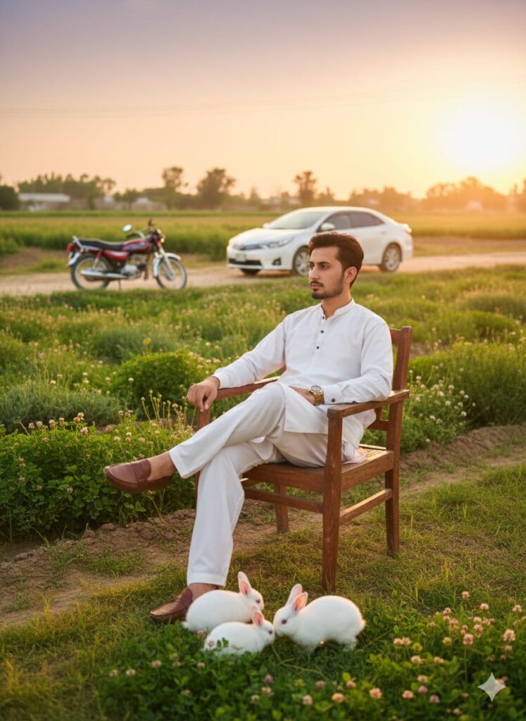A ultra-realistic man sitting cross-legged on a traditional wooden chair in a large green Punjabi garden, wearing a clean white Punjabi suit with a golden wristwatch and black branded shoes. The soft sunlight of sunset glows on his face. In front of him, two small rabbits are playing on the grass. Behind him, a red Honda 125 and a white Corolla Grande are parked about 70 inches away. The background shows lush Punjabi farmland with green grass, trees, and a warm golden atmosphere. The man’s face remains the same as in the given photo, and the whole image looks ultra-original, cinematic, and realistic.