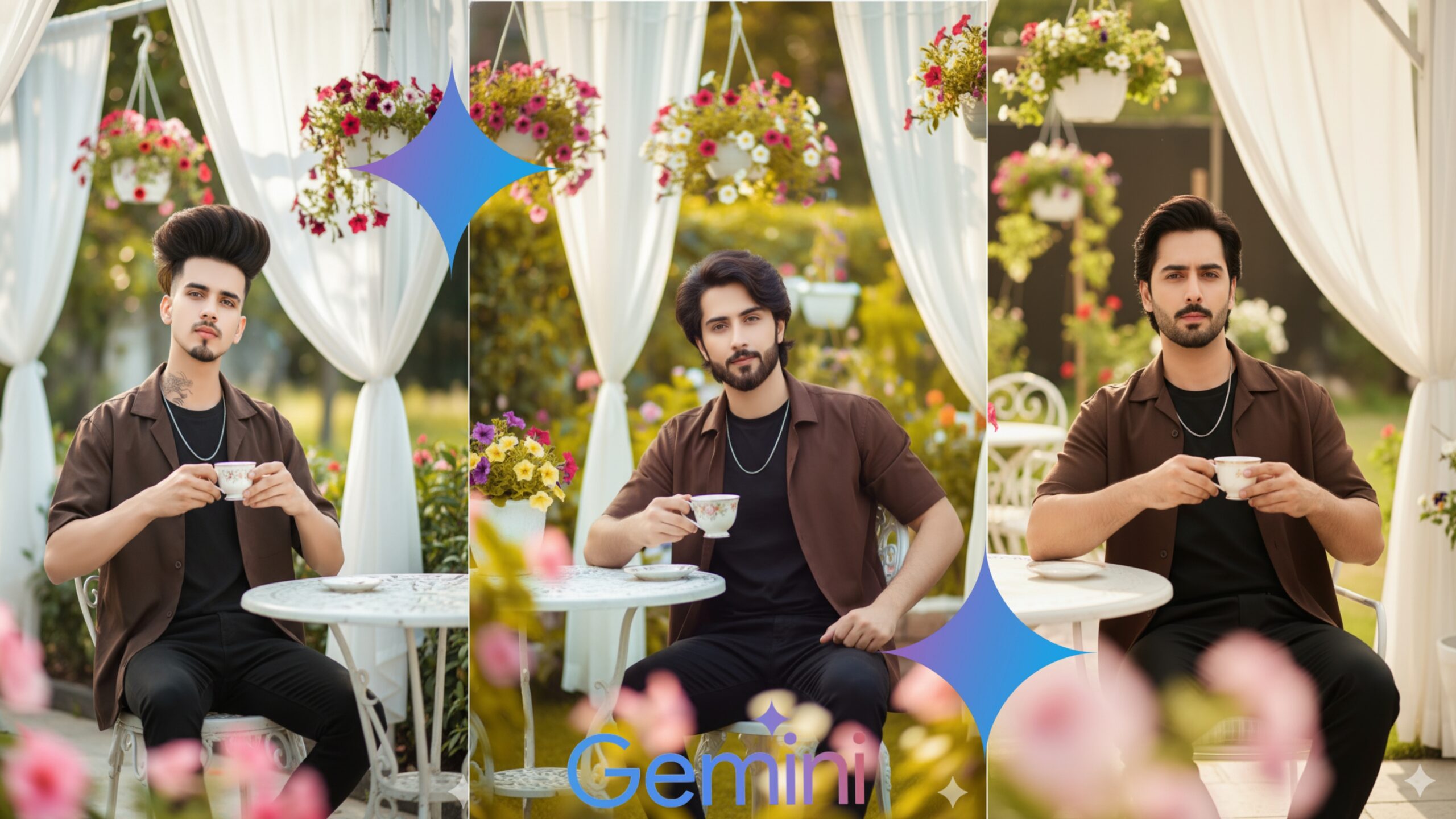>Ultra-photorealistic, cinematic portrait of a stylish young man (same face and hairstyle as the reference image) sitting outdoors at a white table in a garden patio. He’s wearing a dark brown shirt over a tee black pants, and a pati chain, while holding a porcelain teacup with a calm and elegant expression. Soft sunlight highlights his face as he leans back slightly in a relaxed pose. The background features flowing white drapes, hanging flower baskets, and lush greenery, with warm, dreamy lighting and soft pink bokeh in the foreground.